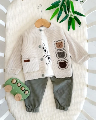 • 3 Ayıcık nakışlı triko hırkalı mevsimlik 3lü bebe takım