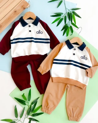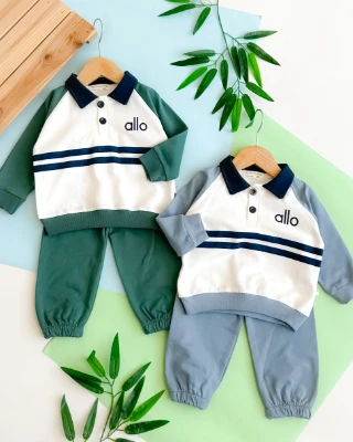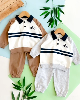 Allo yazılı gömlek yaka detay bilekten büzgülü eşofman mevsimlik 2li takım Bebek Durağı Bebek ve Çocuk Giyim | Bebek Durağı | bebekduragi.com.tr