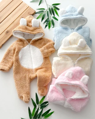 • Ayıcık kulak kapüşon detaylı boydan fermuarlı ayaklı welsoft kışlık tulum
