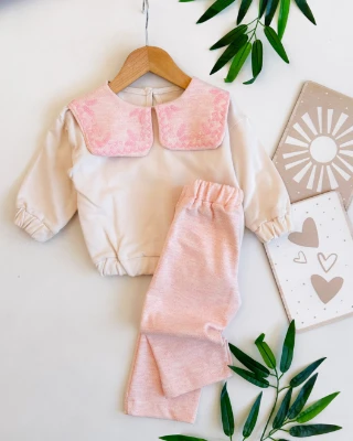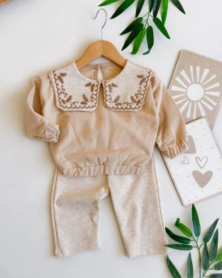 Bebe yaka nakış detaylı soft 2li kız bebe takım