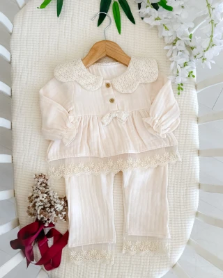 Begonvil çift kat muslin brode detay mevsimlik 2 parça bebe takım
