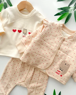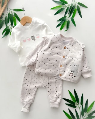 Bonjour kedicik nakışlı puantiyeli ceketli 3 parça takım Bebek Durağı Bebek ve Çocuk Giyim | Bebek Durağı | bebekduragi.com.tr