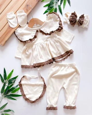 Brode dantel detaylı döküm yakalı mevsimlik yenidoğan 5li set