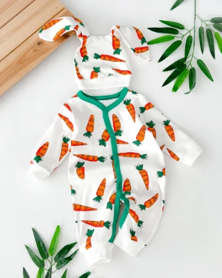 Büyük havuçlar baskılı uzun kulak şapkalı boydan çıtçıtlı mevsimlik 2 parça tulum set