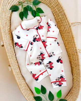 Büyük minnie surat önden düğmeli kenarları biyeli 2 parça pijama takımı Bebek Durağı Bebek ve Çocuk Giyim | Bebek Durağı | bebekduragi.com.tr