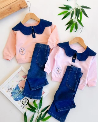 Çiçek nakış kot yaka detaylı 2li kız bebe takım