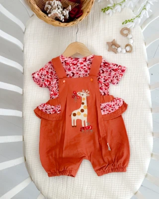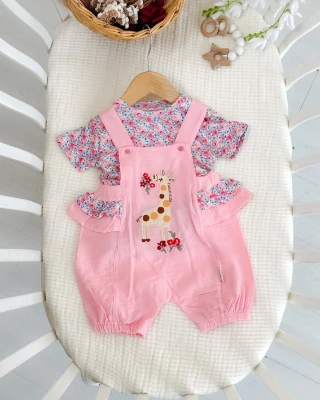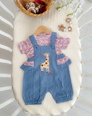Çiçek zürafa nakışlı salopetli yazlık kız bebe tulum