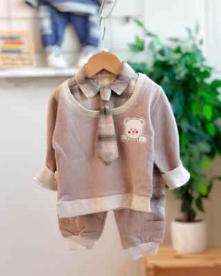 Çıkarılabilir kravatlı sevimli ayıcık nakışlı sahte gömlek görünümlü mevsimlik 3 parça takım Bebek Durağı Bebek ve Çocuk Giyim | Bebek Durağı | bebekduragi.com.tr
