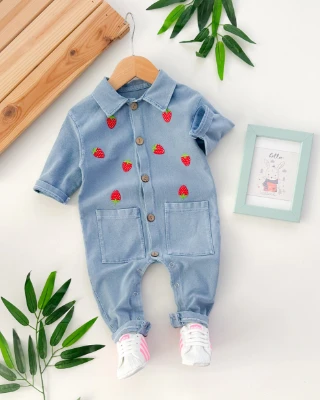 Çilek armalı önden ahşap düğme detaylı kot görünümlü örme kumaş mevsimlik tulum Bebek Durağı Bebek ve Çocuk Giyim | Bebek Durağı | bebekduragi.com.tr