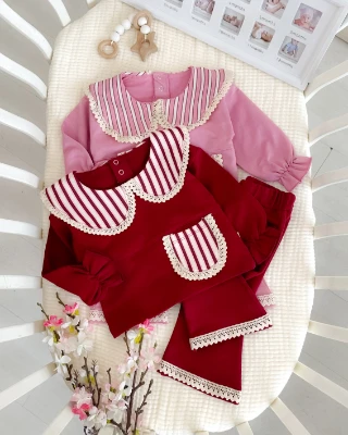 Çizgili yaka ve cep detaylı arkadan çıtçıtlı mevsimlik 2 parça takım Bebek Durağı Bebek ve Çocuk Giyim | Bebek Durağı | bebekduragi.com.tr