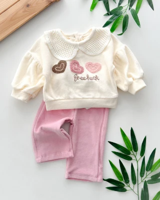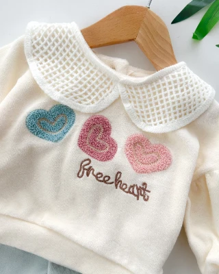 • Free heart nakışlı file bebe yaka detaylı kadife kumaş kışlık 2 parça takım