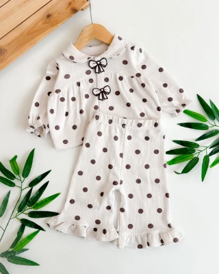 Kurdela kabartmalı çıtçıt iri benekli paçalarda fırfır detaylı mevsimlik 2 parça takım Bebek Durağı Bebek ve Çocuk Giyim | Bebek Durağı | bebekduragi.com.tr