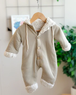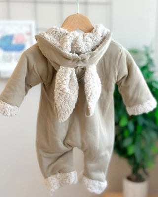 Kürklü tavşan kulak kapüşonlu boydan ahşap düğmeli kışlık tulum Bebek Durağı Bebek ve Çocuk Giyim | Bebek Durağı | bebekduragi.com.tr