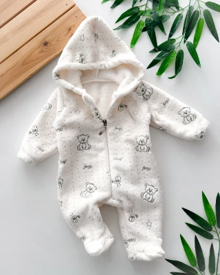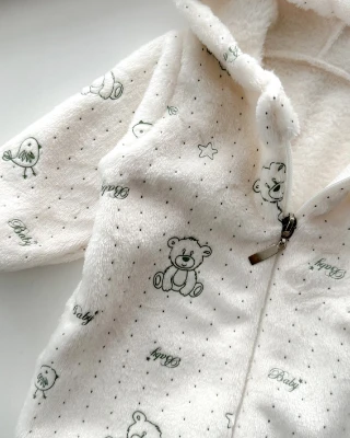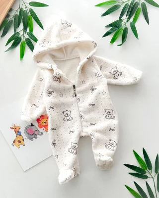 Minik kuş ve ayıcık baskı boydan fermuar kendinden ayaklı kapüşonlu kışlık tulum Bebek Durağı Bebek ve Çocuk Giyim | Bebek Durağı | bebekduragi.com.tr