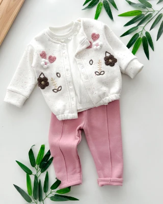 Papatya çiçek kabartmalı taşlı düğme detaylı beli büzgü hırkalı kışlık 3 parça takım Bebek Durağı Bebek ve Çocuk Giyim | Bebek Durağı | bebekduragi.com.tr