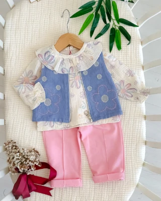 Papatya nakış kot yelekli premium mevsimlik kız bebe takım
