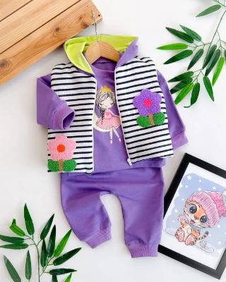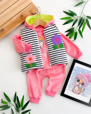 Papatya punch çizgili kapüşon yelekli 3 parça takım Bebek Durağı Bebek ve Çocuk Giyim | Bebek Durağı | bebekduragi.com.tr
