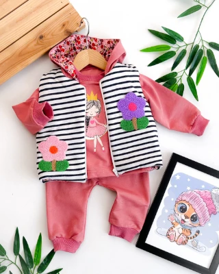 • Papatya punch çizgili kapüşon yelekli 3 parça takım