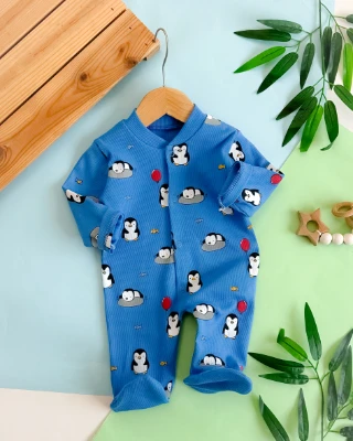 Penguen balık desenli ayaklı ribana kumaş boydan çıtçıtlı bebe tulum