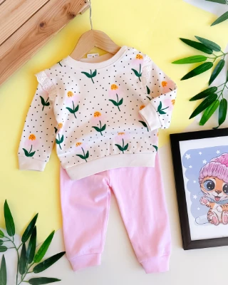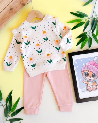 Puantiyeli renkli çiçekler omuzları güpür detaylı mevsimlik 2 parça takım Bebek Durağı Bebek ve Çocuk Giyim | Bebek Durağı | bebekduragi.com.tr
