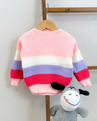 Renkli çizgi detaylı selanik örgülü kız triko kazak