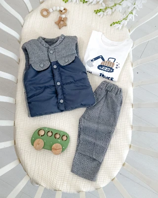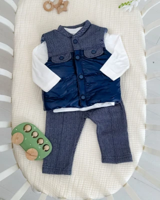 Sahte cep görünümlü şişme yelekli mevsimlik 3lü erkek bebe takım