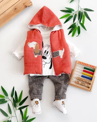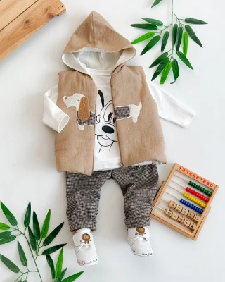 Tüylü köpekçik nakışlı içi astarlı kapüşon yelekli 3 parça takım Bebek Durağı Bebek ve Çocuk Giyim | Bebek Durağı | bebekduragi.com.tr