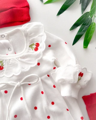 • Yakada ve kollarda kiraz nakışlı arkadan ve alttan çıtçıtlı mevsimlik 3 parça tulum set